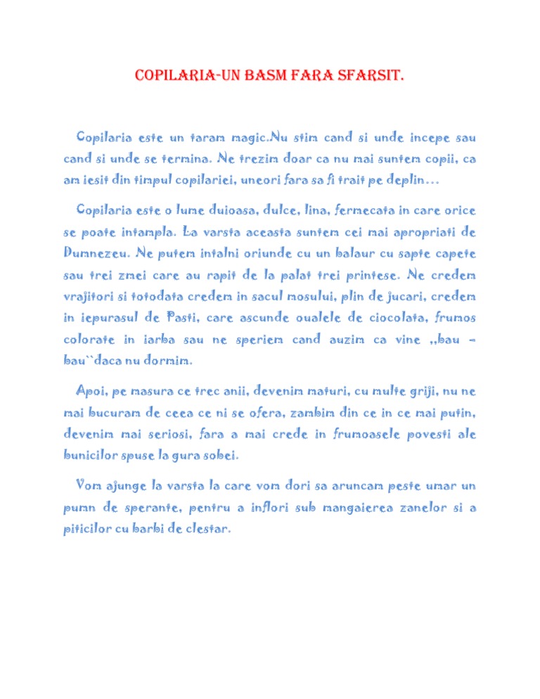 Ne trezim doar că numai suntem copii că am ieşit din copilărie uneori fără să o fi trăit pe deplin. Timpul cînd este cineva copil. Si o comoara prea greu gasita. Copilăria este un tărâm magic.