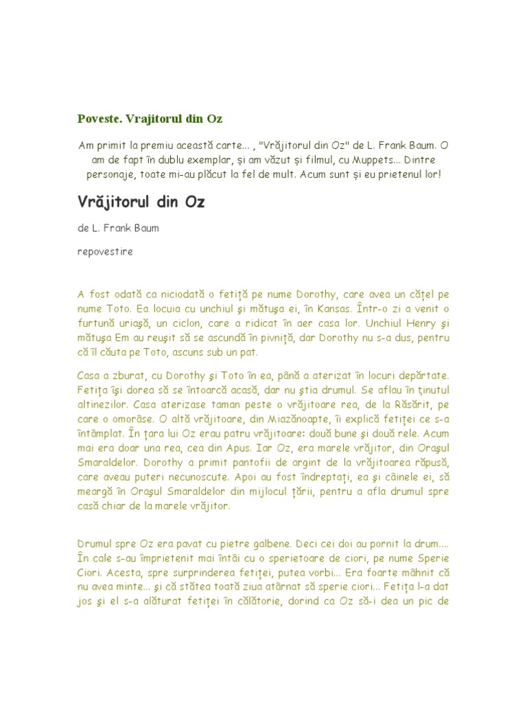Vrăjitorul Din Oz Poveste Scurtă De Adormit Copii Povești